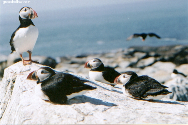 Subject: Atlantic Puffin. Location: Machias Seal Island, ME. Puffins can fly 48-55 mph, flapping their wings up to 400 times each minute. We particularly enjoyed watching them take off, with their little orange feet dangling down behind them!Click on the image to the left to see a larger rendition. |