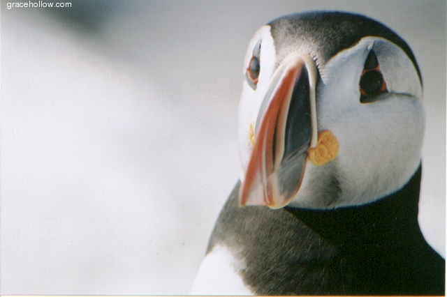 Subject: Atlantic Puffin. Location: Machias Seal Island, ME. In the winter, puffins' bills and feet 'lose' their colors, becoming dull and faded. As breeding season approaches, their colors return.Click on the image to the left to see a larger rendition. |