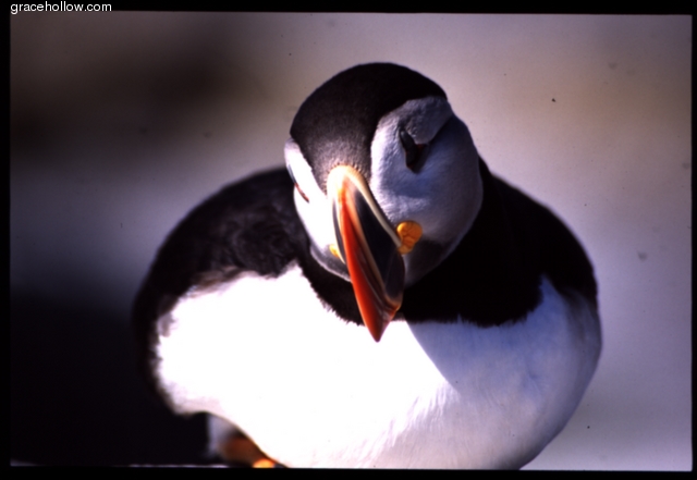 Subject: Atlantic Puffin. Location: Machias Seal Island, ME. Puffins hatch only one egg per year, and then take turns caring for the young, called a "puffling". Pufflings remain in their nests until 40-45 days old.Click on the image to the left to see a larger rendition. |