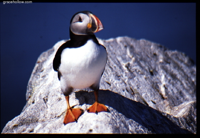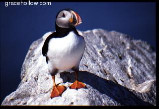 Subject: Atlantic Puffin. Location: Machias Seal Island, ME. The scientific name for a puffin is Fraterluca arctica, Latin for "little brother of the North", or possibly, "little friar of the North".Click on the image to the left to see a larger rendition. |