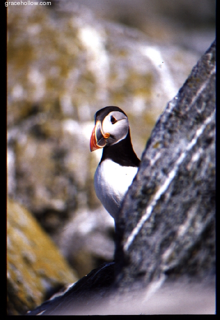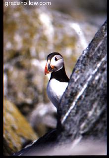 Subject: Atlantic Puffin. Location: Machias Seal Island, ME. Puffins are about 10 inches tall, and, we found, quite curious.Click on the image to the left to see a larger rendition. |