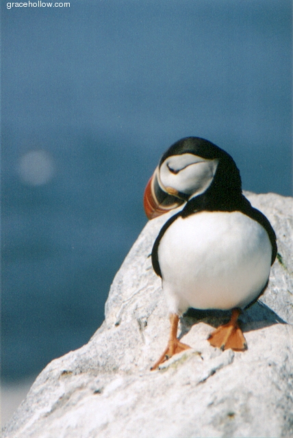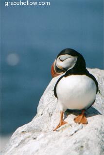 Location: Machias Seal Island, ME. These birds are nicknamed "Sea Parrots" and "Clowns of the Ocean" because of their bright colors.Click on the image to the left to see a larger rendition. |