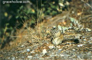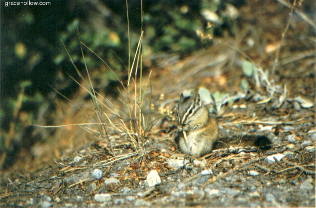 Subject: Chipmunk. Location: Banff National Park, Alberta, Canada. Chipmunks have become quite accustomed to humans in Banff National Park... this little guy came and stood on my shoe, begging for food. Once he realized I wasn't going to feed him, he noticed some nice ripe grasses nearby.Click on the image to the left to see a larger rendition. |