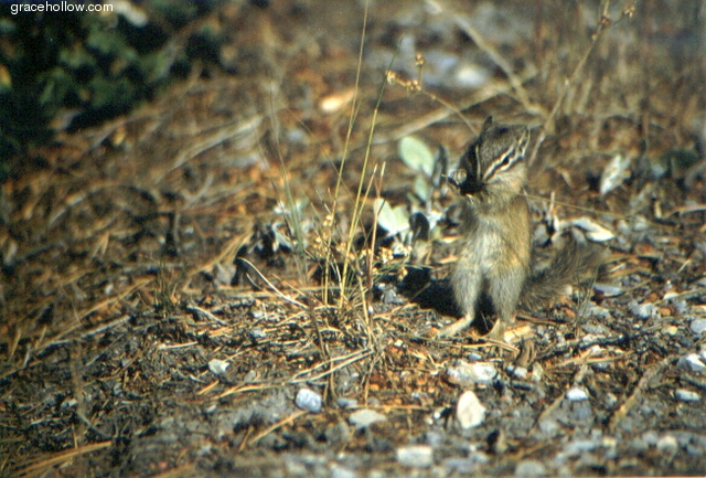 Chipmunks have become quite accustomed to humans in Banff National Park... this little guy came and stood on my shoe, begging for food. Once he realized I wasn't going to feed him, he noticed some nice ripe grasses nearby.