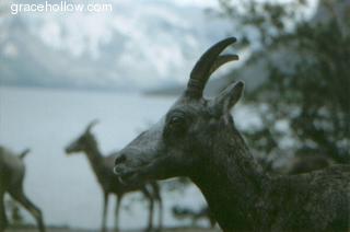 Subject: Rocky Mountain bighorn sheep. Location: Lake Minnewanka, Banff National Park. Flocks of ewes and their young frequent Lake Minnewanka and Two Jack Lake.Click on the image to the left to see a larger rendition. |