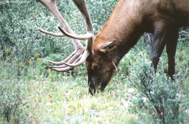 Subject: Elk. Location: Icefields Parkway, Jasper National Park; Alberta, Canada. We came across this fella as we were driving on the Icefields Parkway between Lake Louise and Jasper. He was slowly making his way down the meadow on the side of the road, stopping to sample the grass as he went.Click on the image to the left to see a larger rendition. |