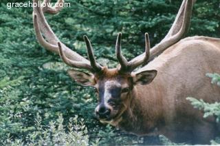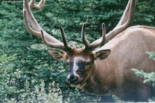 Subject: Elk. Location: Icefields Parkway, Jasper National Park; Alberta, Canada. We found this elk with a beautiful set of antlers meandering through a meadow in the early evening, grazing as he went. I caught this one just as he looked up from his dinner.Click on the image to the left to see a larger rendition. |