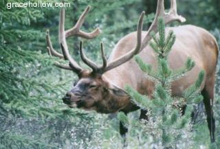 Subject: Elk. Location: Icefields Parkway, Jasper National Park; Alberta, Canada. This elk with the magnificent antlers was munching his way across a meadow in Jasper National Park. I don't know which of us was more surprised by his sneeze, but I was happy to catch it on film.Click on the image to the left to see a larger rendition. |