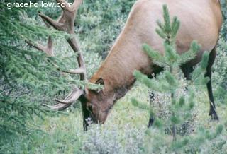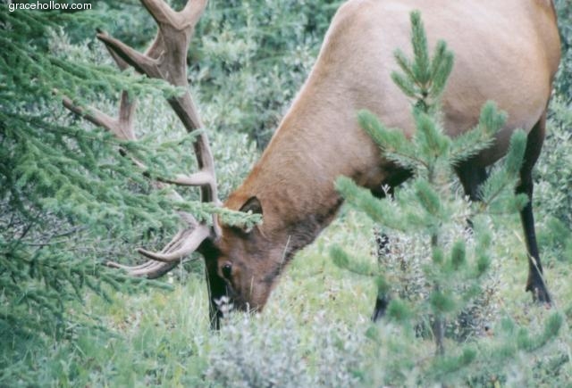 Subject: Elk. Location: Icefields Parkway, Jasper National Park; Alberta, Canada. The elk love to come out near sundown in Jasper National Park. This one was feeding in a meadow-wide salad bar as I came across him. Another shot shows him sneezing; here he is happily munching along.Click on the image to the left to see a larger rendition. |