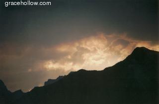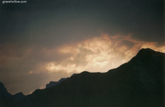 Subject: Sunset over Mountain. Location: Banff, Alberta, Canada. This striking sunset image is partially caused by the smoke from fires that were burning all around and inside Banff National Park the summer we were there. Our views were punctuated by helicoptors flying overhead carrying bladders towards the fires.Click on the image to the left to see a larger rendition. |