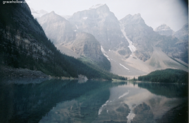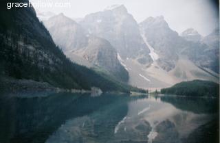 Subject: Mountain Lake. Location: Lake Moraine. This early-morning shot of the mountains reflecting out of calm Lake Moraine really captured the peacefulness of a walk along the shore. Glacier snow on the mountainside forms a strong contrast with the dark pines along the shore.Click on the image to the left to see a larger rendition. |