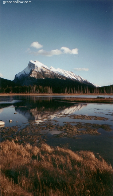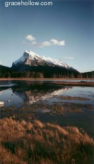 Subject: Snow-capped mountain reflected in lake. Location: Banff National Park Vermillion Lakes region. Lazy clouds drifted by on this sunny day in the Vermillion Lakes region of Banff National Park. The lakes were glassy-smooth, forming beautiful reflections of the striking mountains behind. This view showed the lakeside grasses as well.Click on the image to the left to see a larger rendition. |