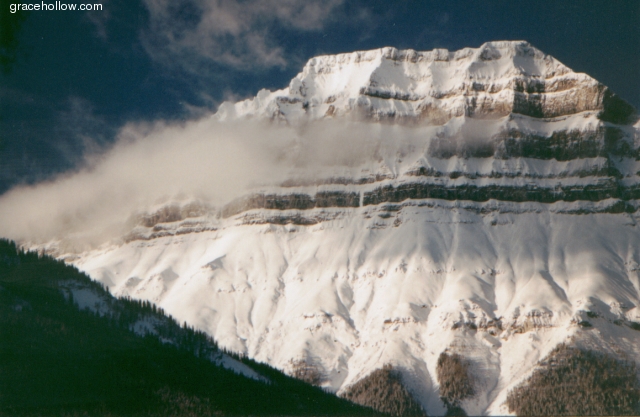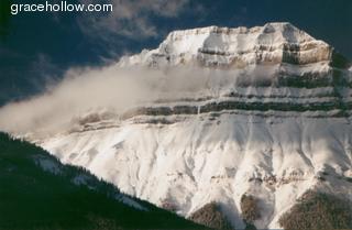 Subject: Pilot Mountain in Banff National Park. Location: Banff National Park. Clouds and snow conspired to provide multi-scale stripes against a deep blue sky on this beautiful day in Banff National Park. Patches of trees on the slopes and the shadowed silhouette in the forground balance the picture, forming a dark/light symmetry.Click on the image to the left to see a larger rendition. |