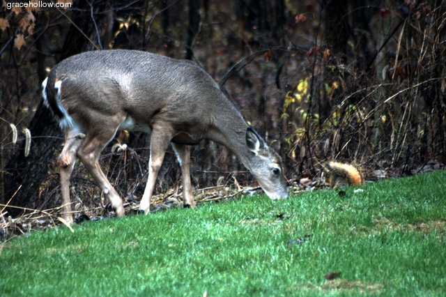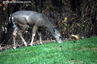 Subject: Animal and squirrel sharing a meal. Location: Bloomington, Indiana. Click on the image to the left to see a larger rendition. |